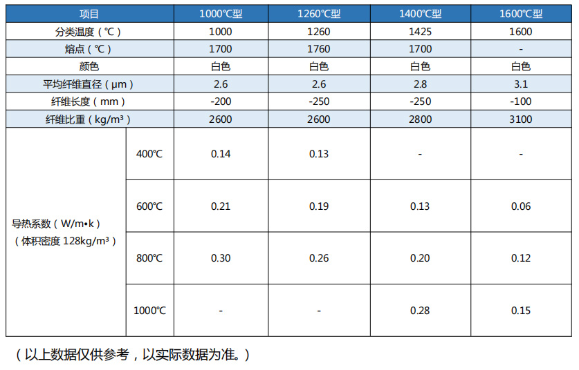 密度:定制;导热系数(128kg/m3):0.1-0.3;使用温度:1000-1600°C