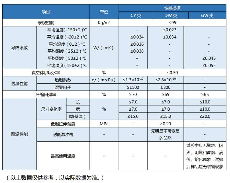 密度:40*80kg/m³;导热系数:0℃时≤0.03w/m.k ;使用温度:-40℃至105℃